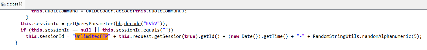 If we can’t exploit directory traversal within the file name field, how can we instead manipulate the session ID to a known value? Reverse engineering this portion of the code revealed the following functionality, which showed an optional query parameter, bb.decode(KVhV), being used to construct the session ID.