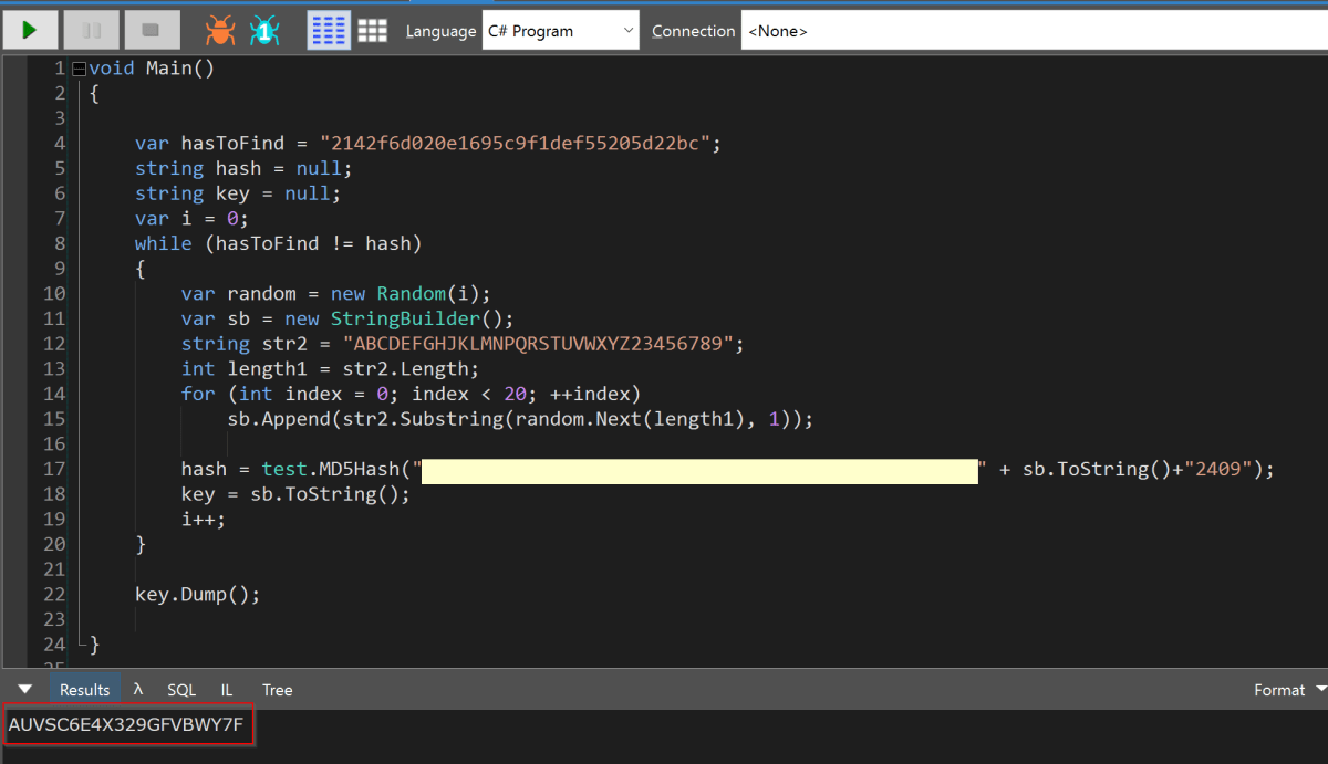 In order to recover the key, the following C# was written in (you guessed it!) LinqPad (https://www.linqpad.net/).