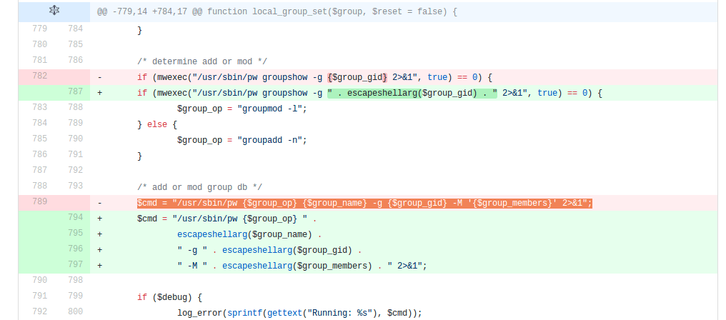 4. This is then passed to a function called mwexec() without first undergoing any kind of escaping or filtering, which appears to call a system binary /usr/sbin/pw with the stringified array now part of its arguments.