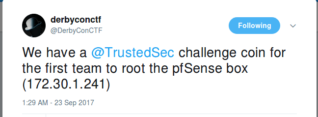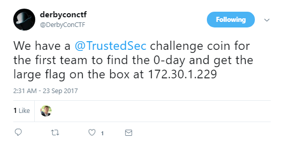 We hadn’t really looked too much at this box until the tweet below came out. A good tip for the DerbyCon CTF (and others) is to make sure that you have alerts on for the appropriate Twitter account or whatever other form of communication the organizers may decide to use.