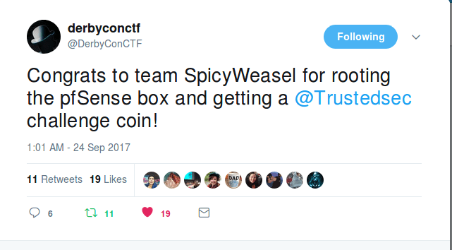The excellent Derbycon 2017 has just come to an end and, just like last year, we competed in the Capture The Flag competition, which ran for 48 hours from noon Friday to Sunday. As always, our team name was SpicyWeasel. We are pleased to say that we finished in first place, which netted us a black badge.