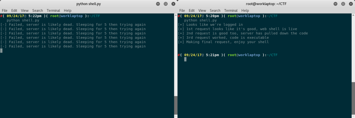 It was well worth the small amount of time it took to do this, and by the end of the CTF we had a script that more or less auto-pwned every box we had shell on.