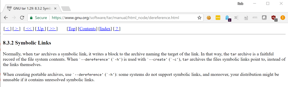 One of the more interesting properties of tar is that, by default, it doesn’t follow symlinks. Rather, it will add the symlink to the archive. In order to archive the file and not the symlink, you can use the --h or --dereference flag, as shown below.