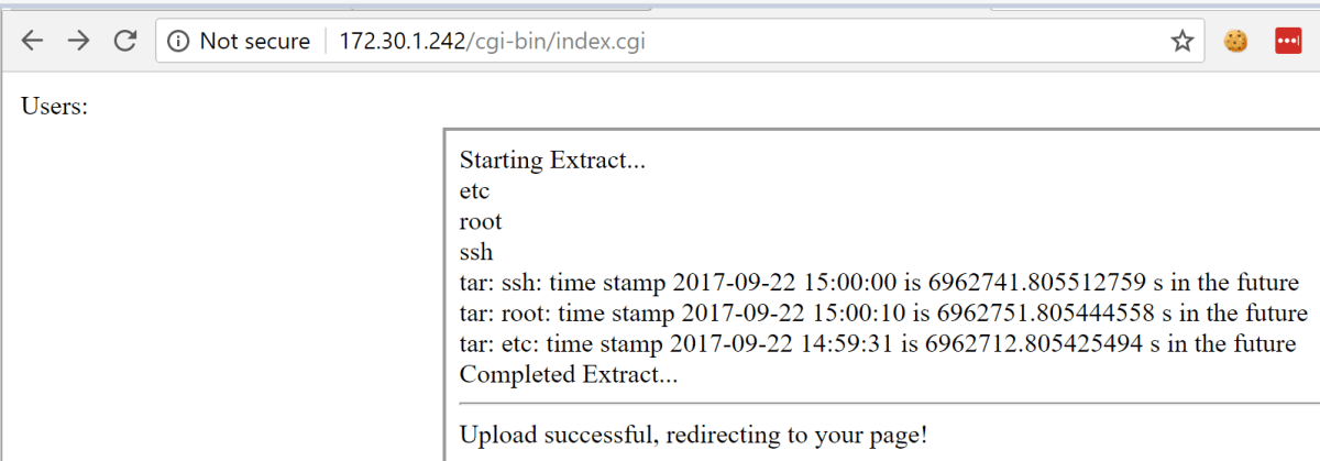 Once we had created an account and logged in, we were redirected to the page shown below. Interestingly it allowed you to upload tar.gz files, and tar files have some interesting properties… By playing around with the site, we confirmed tar files that were uploaded were indeed untar’d and the files written out to the /users/ path.