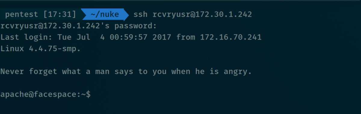 Awesome – we had access. We stuck the hash for rcvryusr straight into hashcat and it wasn’t long before the password of backup was returned and we were able to login to the box via SSH.