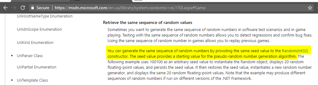 This is not random in the way the vendor wanted it to be. As the documentation states below, by providing the same seed will mean the same sequence. The seed is a 32bit signed integer meaning that there will only ever be 2,147,483,647 combinations.