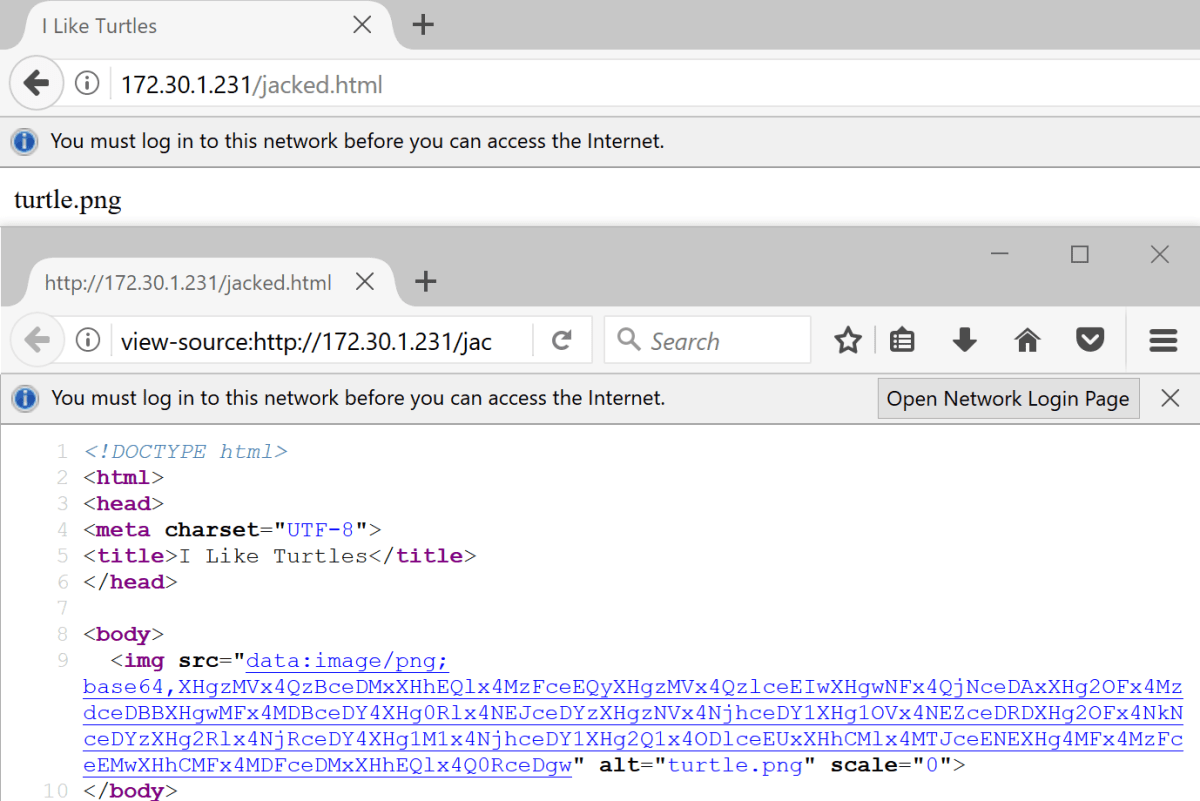 While browsing the web root directory (directory listings enabled) on the 172.30.1.231 web server, we came across a file called jacked.html. When rendered in the browser, that page references an image called turtles.png, but that didn’t show when viewing the page. There was a bit of a clue in the page’s title “I Like Turtles”… we guess somebody loves shells!
