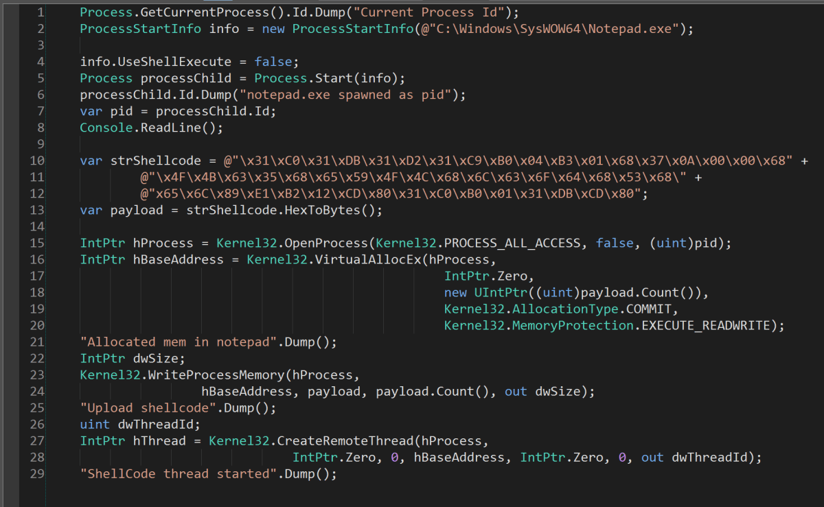The escape sequence definitely had the look of x86 about it, so back to LinqPad we go in order to run it. We have a basic shellcode runner that we sometimes need. Essentially, it opens notepad (or any other application of your choosing) as a process and then proceeds to alloc memory in that process. The shellcode is then written into that allocation and then a thread is kicked off, pointing to the top of the shellcode. The script is written with a break in it so that after notepad is launched you have time to attach a debugger. The last two bytes are CD 80 which translates to Int 80 (the System Call handler interrupt in Linux and a far superior rapper than Busta).