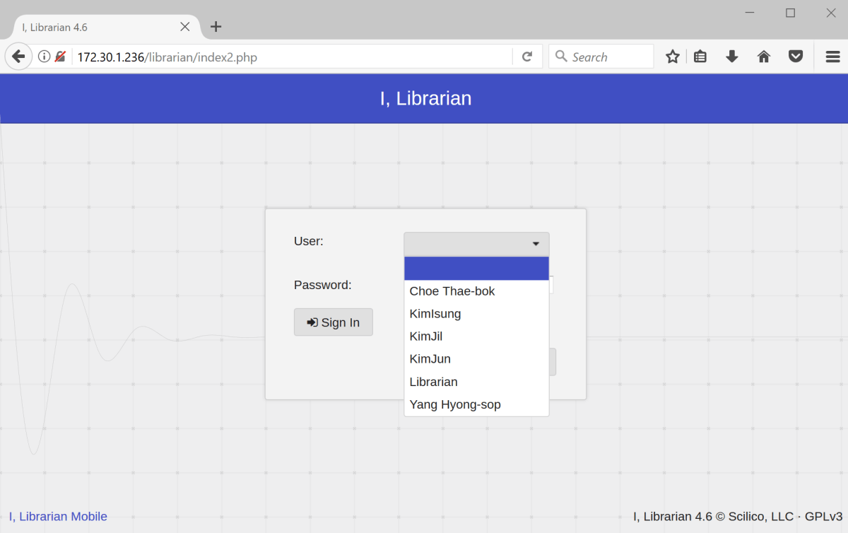 When browsing to the 172.30.1.236 web server, we found the iLibrarian application hosted within a directory of the same name. The first two notable points about this site were that we had both a list of usernames in a drop down menu (very curious functionality) and, at the bottom of the page, was a version number. There was also the ability to create a user account.