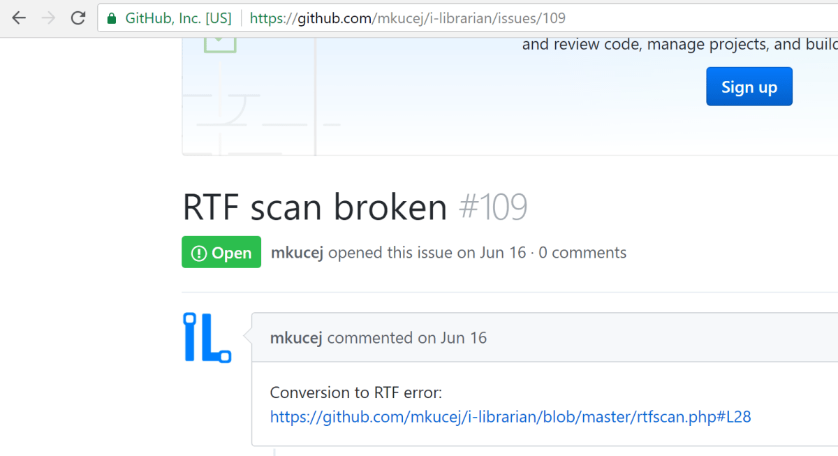 A good source of information about recent changes to a project is the issues tab on GitHub. Sometimes, security issues will be listed. As shown below, on the iLibrarian GitHub site one of the first issues listed was “RTF Scan Broken”. Interesting title; let’s dig a little further.