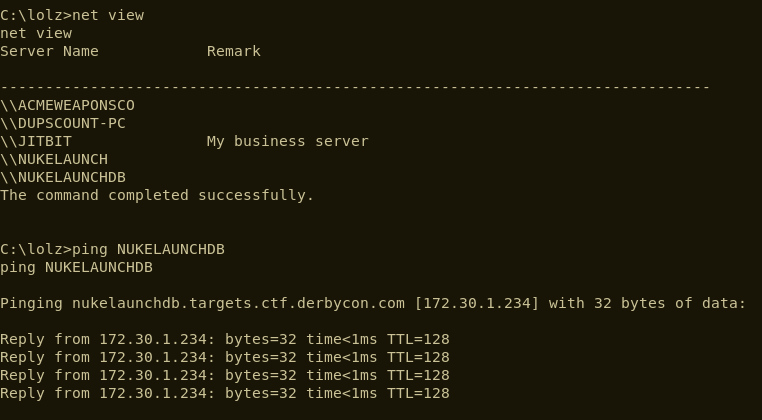 At this stage, we made some educated guesses about the password for the sa account and used CLR-based custom stored procedures (http://sekirkity.com/command-execution-in-sql-server-via-fileless-clr-based-custom-stored-procedure/) to gain access to the underlying operating system on NUKELAUNCHDB.