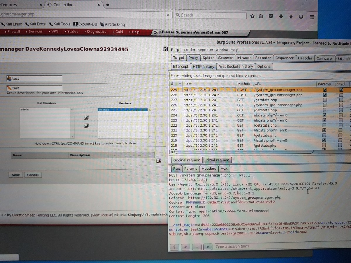 A few hours were burned looking for various vulnerabilities, but to no avail. When looking at the source code, nothing immediately jumped out as vulnerable within the page itself, but then pfSense does make heavy use of includes and we were approaching the review using a pretty manual approach.