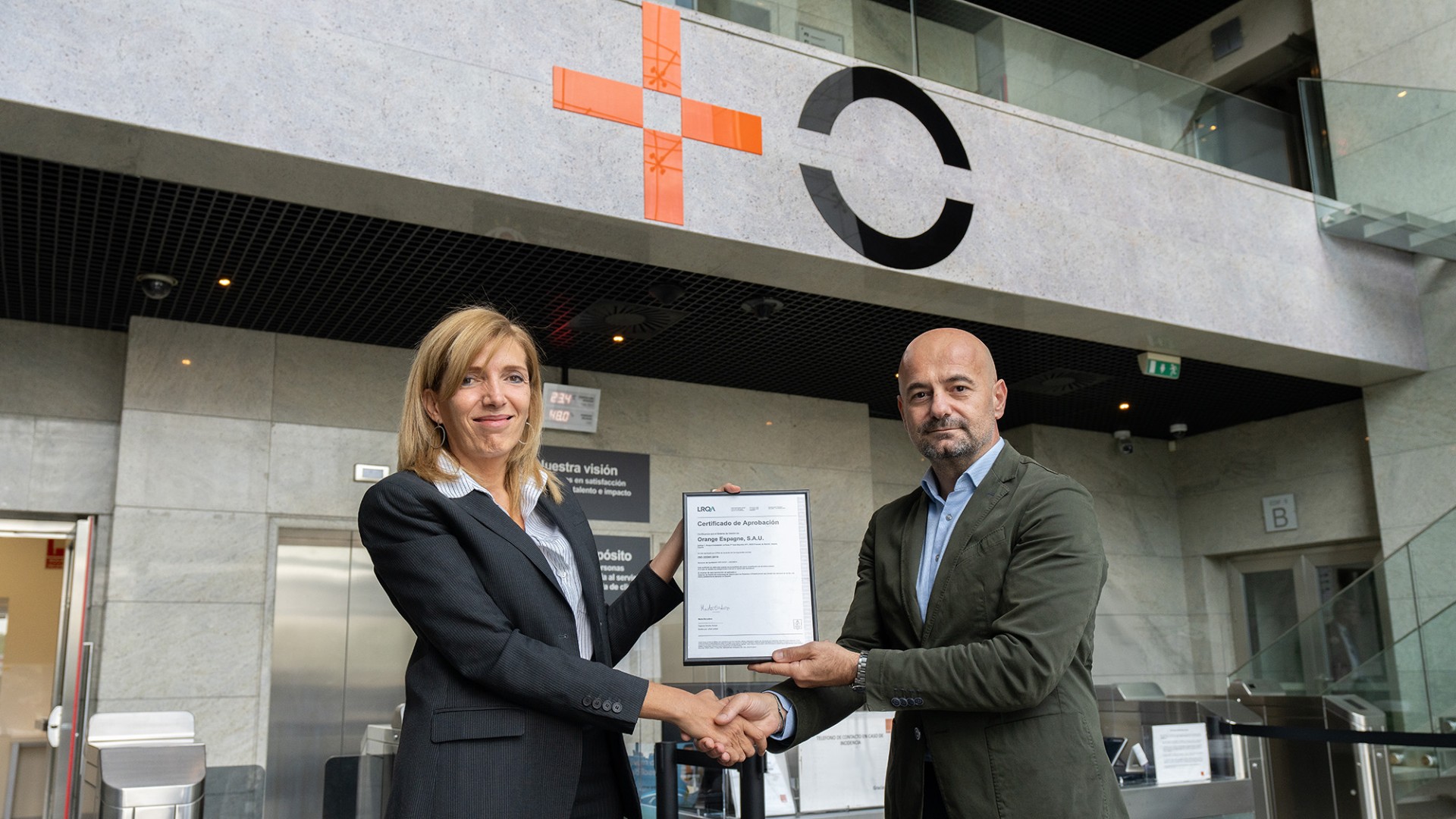 À l'issue du processus de recertification et d'examen technique, Olga Rivas, directrice technique pour la région Ibéria chez LRQA, a remis le nouveau certificat ISO 22301:2019 accrédité par l'UKAS à José Antonio Vázquez, directeur de la sécurité chez MASORANGE.